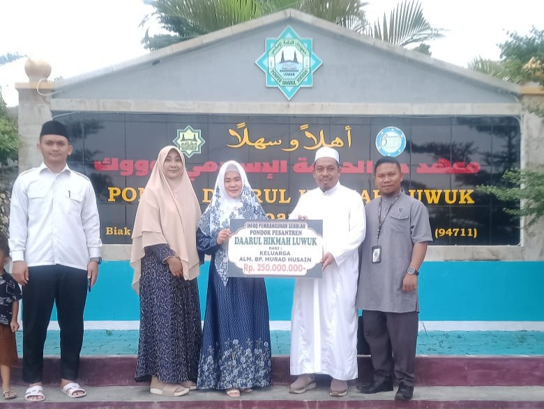 Terbaru, keluarga besar Alm H Murad Husain melalui salah satu putrinya, Hj. Wardani Murad Husain, menyalurkan infak sebesar Rp 250 juta untuk pengembangan Pondok Pesantren (Ponpes) Darul Hikmah Luwuk, Jumat (14/6/2024).
