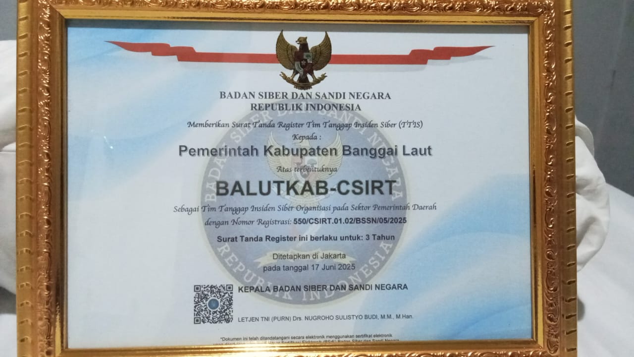 Dengan terdaftarnya BALUTKAB-CSIRT di BSSN, Kabupaten Banggai Laut kini secara resmi menjadi bagian dari jaringan keamanan siber nasional.