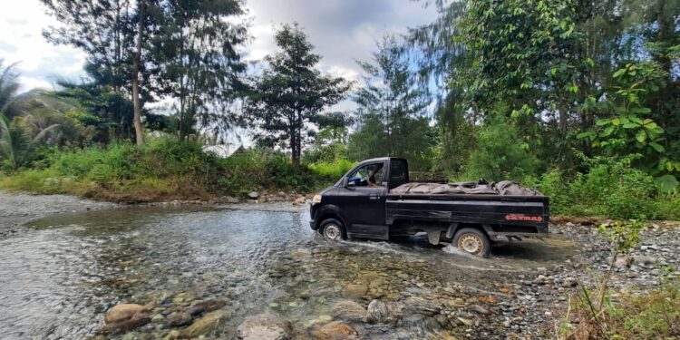 Kendaraan roda empat dan di atasnya terpaksa harus menyeberangi sungai, yang sering kali berarus deras banjir saat hujan.