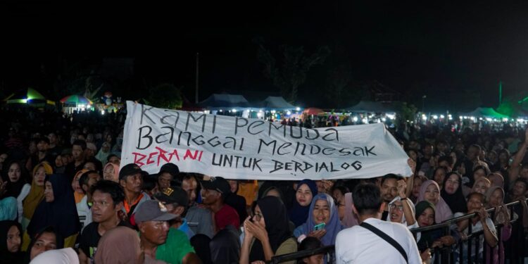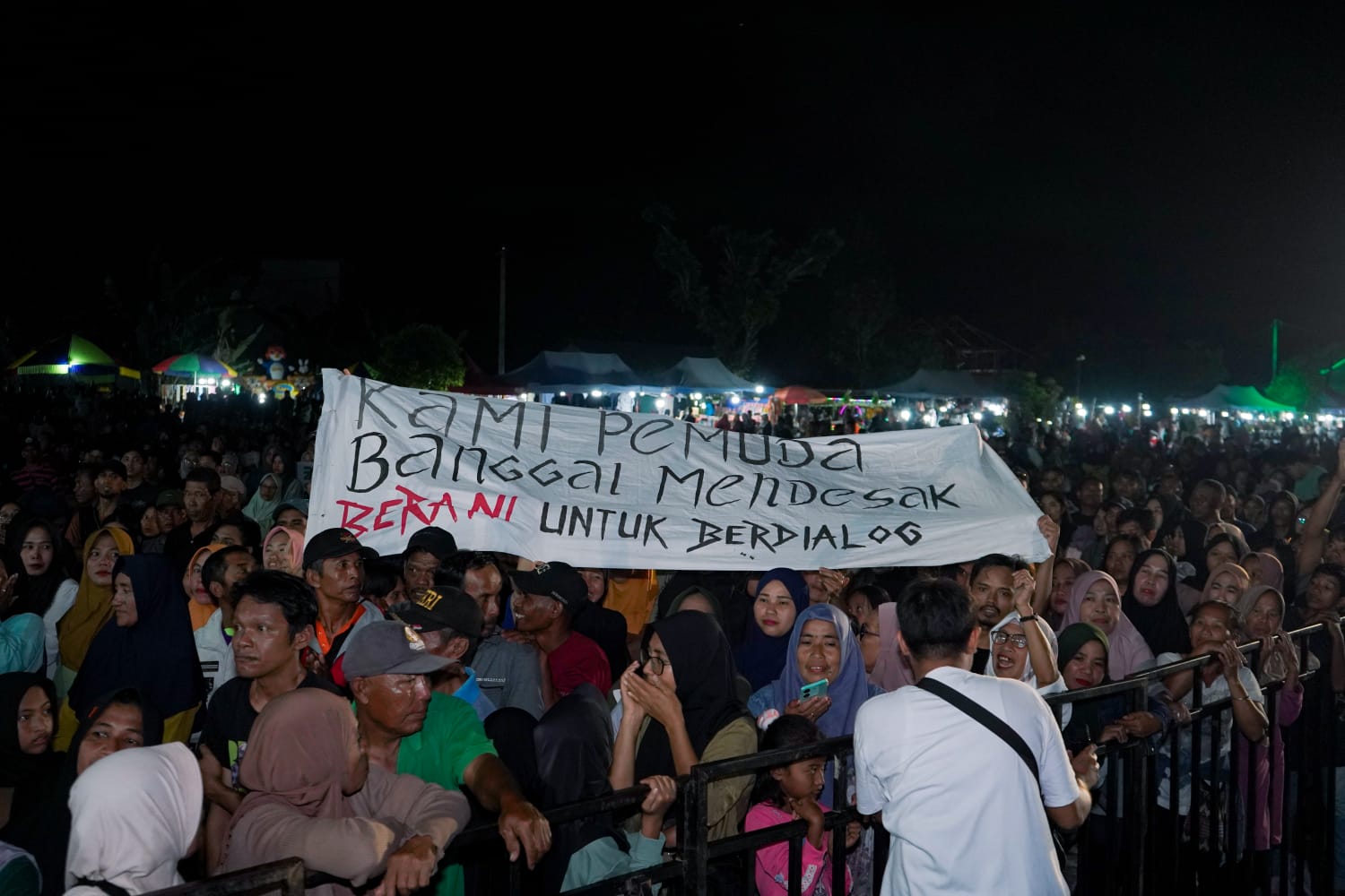 Terlihat baliho terbentang di tengah kerumunan massa saat deklarasi pasangan dengan tagline ‘Berani’ itu bertuliskan “Kami Pemuda Banggai Mendesak Berani untuk Berdialog.