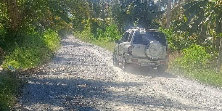 Jalan yang menjadi urat nadi aktivitas ekonomi warga tersebut kini dipenuhi batu-batu besar yang menonjol ke permukaan dan berlubang, mengancam keselamatan para pengendara.