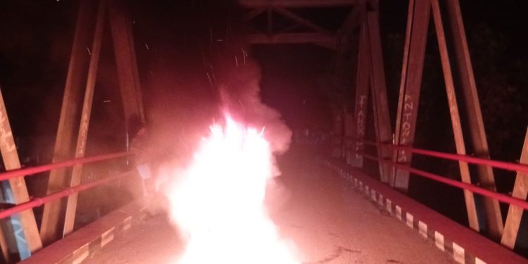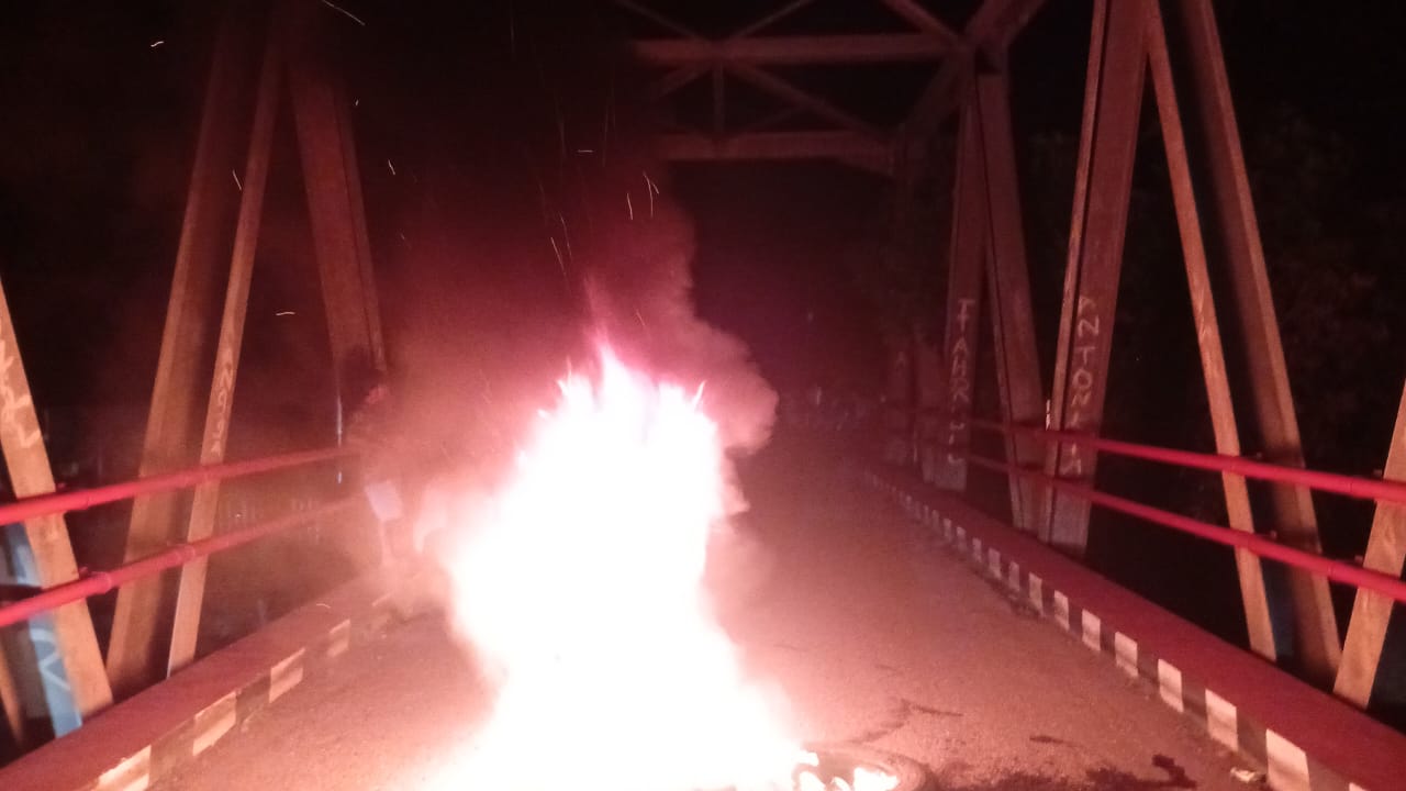 Sebuah ban bekas dinyalakan di tengah jalan Trans Sulawesi, tepat di jembatan perbatasan Kelurahan Bunta 2 dan Bunta 1, sehingga pengendara masih terhenti kurang lebih 30 menit.
