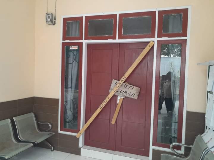 Tulisan ganti Lurah terlihat pada kayu dan papan yang digunakan memalang pintu kantor Kelurahan Tanjung Tuwis.