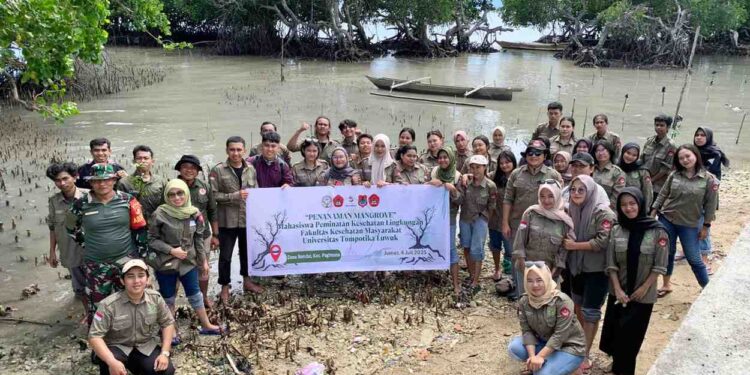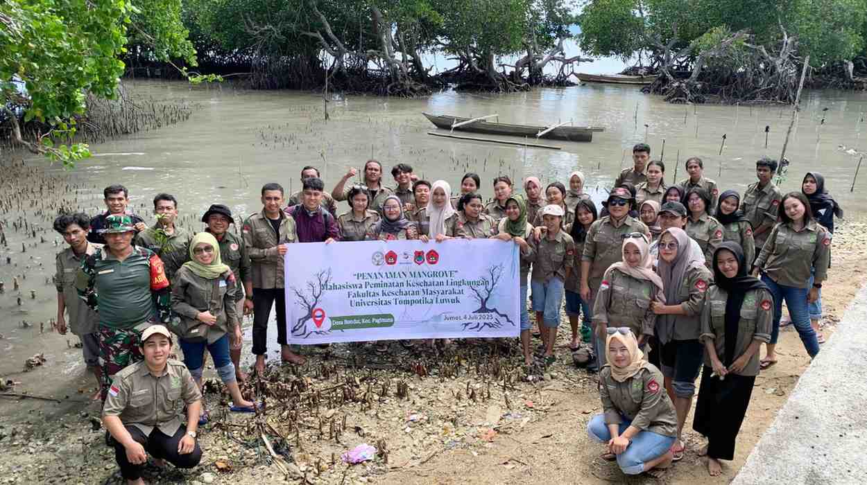 KILASBANGGAI.COM, PAGIMANA– Puluhan mahasiswa program studi Kesehatan Masyarakat Universitas Tompotika (Untika) Luwuk melaksanakan kegiatan penanaman mangrove di pesisir Desa Bondat, Kecamatan Pagimana, Kabupaten Banggai, Jumat (4/7/2025).