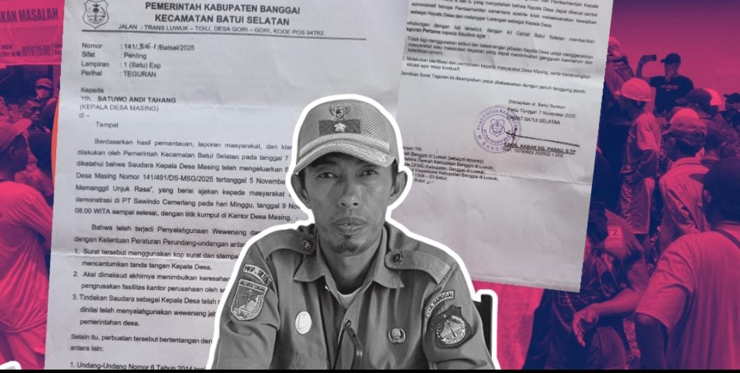 Camat Batui Selatan, Faidil Akbar Dg Pasau, memberikan teguran pertama kepada Kades Masing yang tertuang dalam surat nomor 141/316.1/Batsel/2025 tertanggal 7 November 2025.