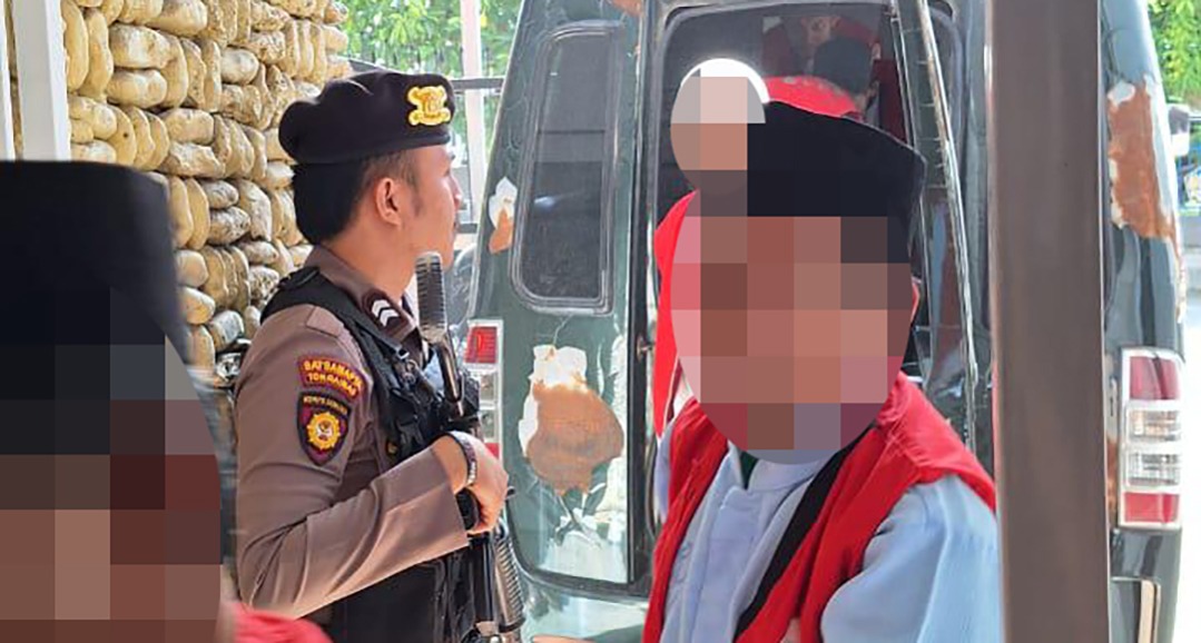 Sebanyak 2 orang Personil Sat Samapta untuk memastikan 20 tahanan pria dewasa dibawa dengan aman menggunakan kendaraan dinas Kejaksaan.