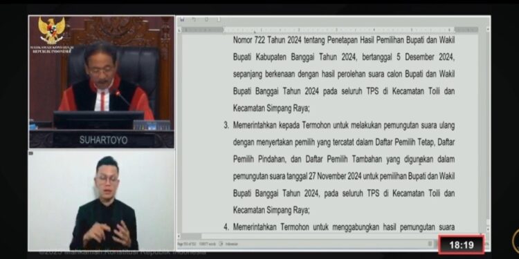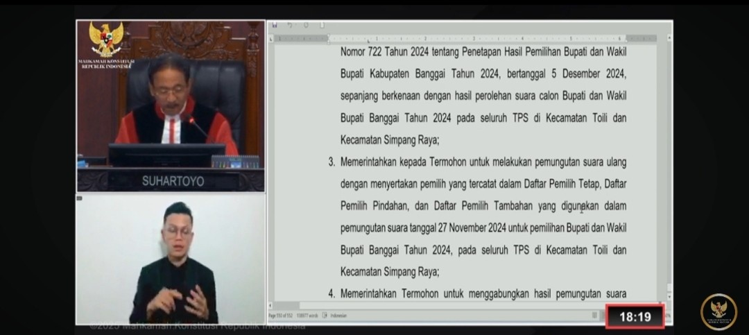 KILASBANGGAI.COM, JAKARTA-Mahkamah Konstitusi (MK) memutuskan pemungutan suara ulang di seluruh TPS di 2 kecamatan pada sengketa Pilkada Banggai 2024.