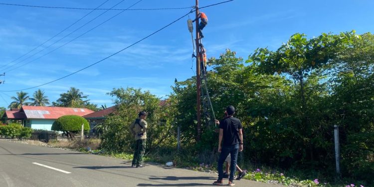 KILASBANGGAI.COM, BANGGAI- Pasiter Kodim 1308/LB Kapten Inf Supartono turun langsung mendampingi pemasangan lampu jalan di Desa Moilong dan Desa Minahaki, Kecamatan Moilong, Kabupaten Banggai, Sulawesi Tengah.