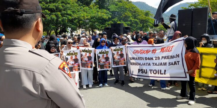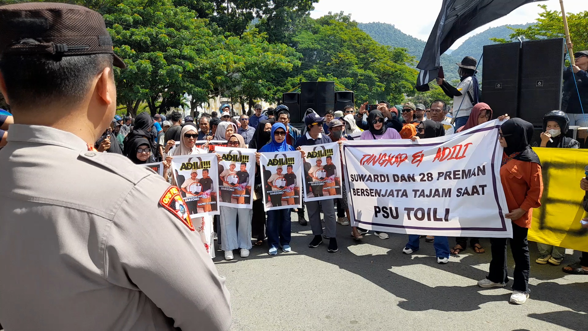 Massa aksi yang dipimpin Mutaqqin Suling ini kembali mempertanyakan progres pengaduan 2 anggota DPRD Banggai dari Fraksi Gerindra, Lutfi Samaduri dan Suwardi, atas dugaan pelanggaran kode etik saat pelaksanaan Pemungutan Suara Ulang (PSU) Pilkada Banggai 5 April 2025 lalu di Kecamatan Toili.
