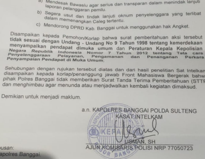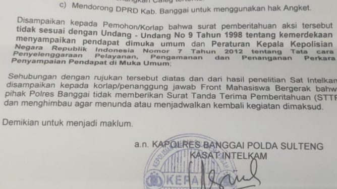 KILASBANGGAI.COM – Melalui surat resmi, Polres Banggai tidak mengeluarkan Surat tanda terima pemberitahuan aksi Front Mahasiswa Bergerak.