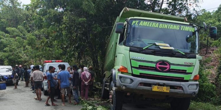 KILASBANGGAI.COM,BATUI SELATAN- Truk muatan material sirtu gagal melewati tanjakan hingga berujung mundur dan menabrak motor di belakangnya di Batui Selatan, Kabupaten Banggai. Satu orang meninggal dunia akibat kejadian tersebut.