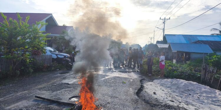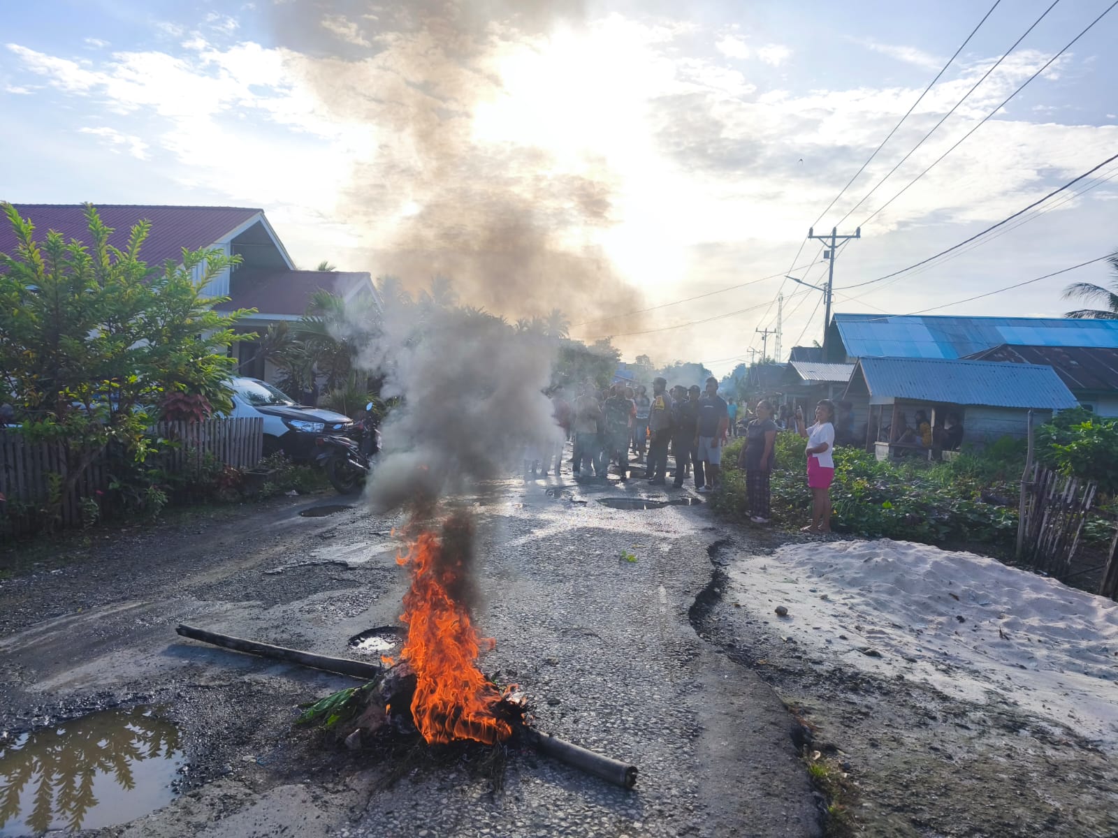 KILASBANGGAI.COM,MANTOH- Warga melakukan aksi sembari memblokir jalan umum dengan membakar ban bekas di Desa Pondan, Kecamatan Mantoh, Kabupaten Banggai, Sulawesi Tengah pada Sabtu (8/2/2025) sekitar pukul 06.30 Wita.