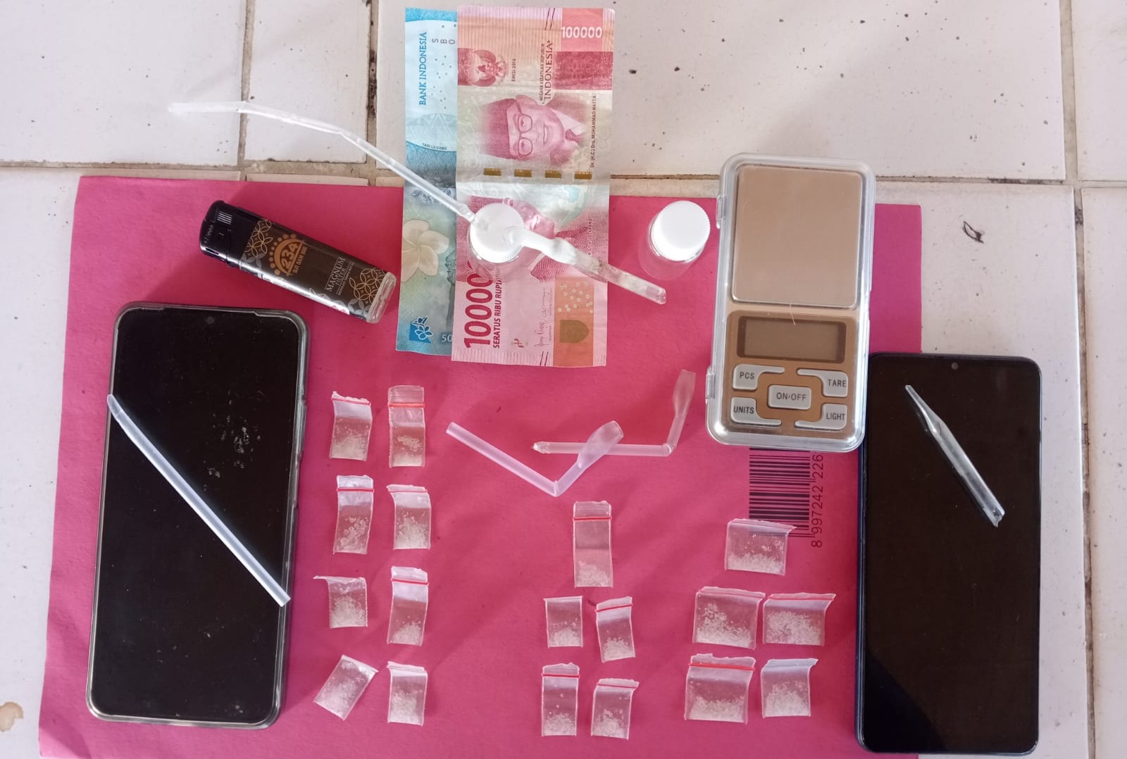 Dari penangkapan ini barang bukti yang ditemukan yakni 18 sachet plastik kecil berisi kristal bening dengan berat bruto 2,66 gram yang diduga narkoba jenis sabu-sabu.
