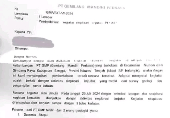 Surat itu menyebutkan pemberitahuan kegiatan eksplorasi lanjutan PT Gemilang Mandiri Perkasa atau GMP.