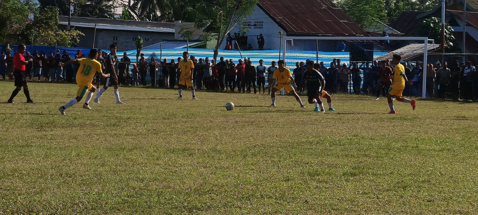 Di bawah terik matahari yang menyengat, salah satu pemain Pongian FC kolaps di tengah lapangan.
