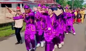 Putra-putri Desa Laonggo yang dikoordinir langsung oleh Kepala Desa Nelson Unsong itu menggunakan baju adat berwarna ungu yang identik baju adat Sangihe.