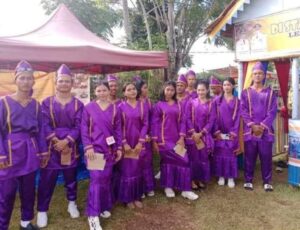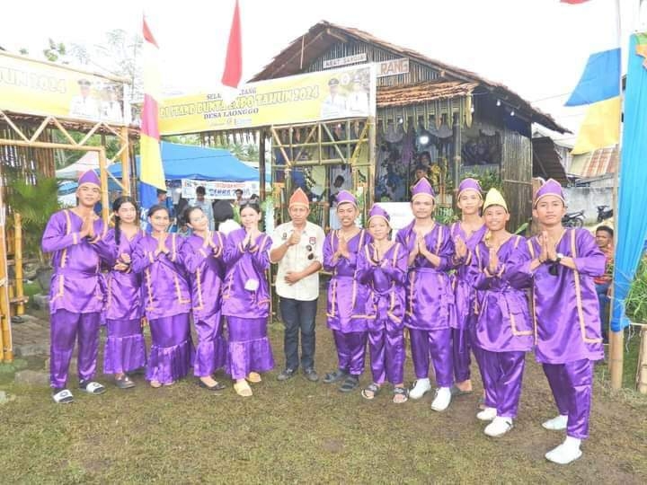 Putra-putri Desa Laonggo yang dikoordinir langsung oleh Kepala Desa Nelson Unsong itu menggunakan baju adat berwarna ungu yang identik baju adat Sangihe.
