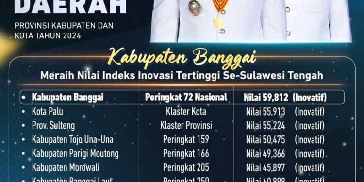 Dalam penilaian tahun ini, Pemerintah Kabupaten Banggai mencatat skor 59,81 yang menempatkannya pada peringkat ke-72 secara nasional dan dikategorikan sebagai daerah “inovatif.”