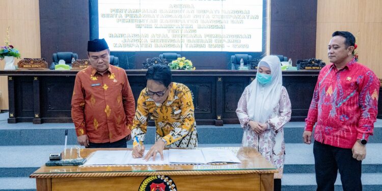 Dihadapan 24 orang anggota dewan yang hadir, Unsur Forkopimda, para Asisten di lingkup Setda Kabupaten Banggai dan Staf Ahli Bupati, serta sejumlah Kepala Perangkat Daerah, Nota Kesepakatan yang bernomor 100.3.7.1/48/NK/Bappeda tanggal 21 Juli 2025 dan Nomor 09/Pim.DPRD/VII/2025 tanggal 21 Juli 2025 tentang Rancangan Awal Rencana Pembangunan Jangka Menengah Daerah (RPJMD) Kabupaten Banggai Tahun 2025-2029 tersebut ditandatangani.