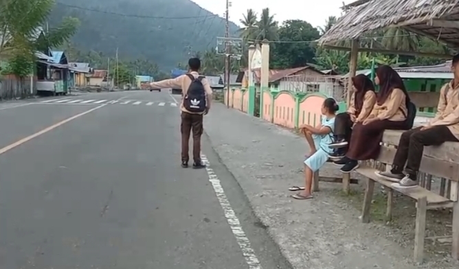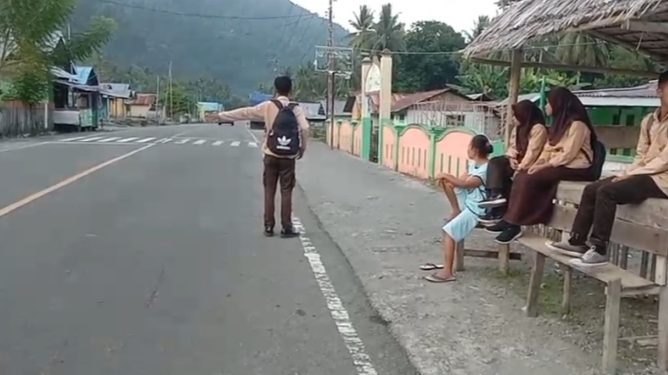 Siswa-siswi dari Desa Lontio, Kecamatan Bunta, selalu menunggu tumpangan kendaraan di tepi jalan Trans Sulawesi. Sekolah mereka cukup jauh, di ibukota Kecamatan Lobu.